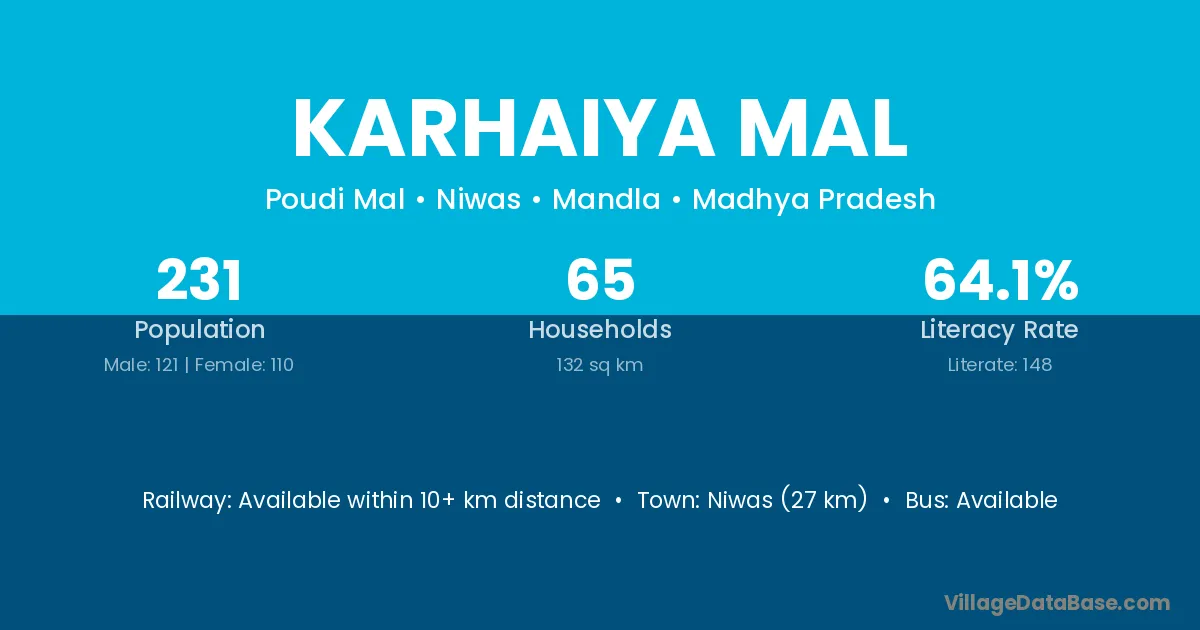 Karhaiya Mal village has a total population of 231 people, of which 121 are males and 110 are females.