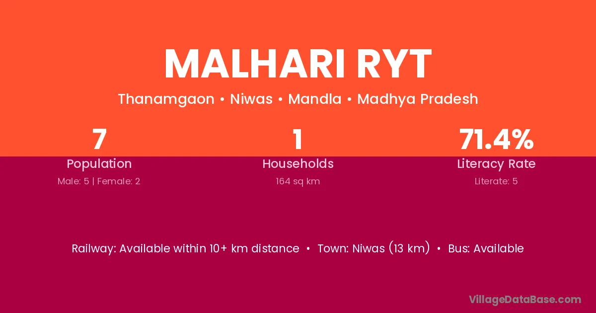 Niwas (13 km) is the nearest town to Malhari Ryt village for major economic activities and is located approximately 13 km away.