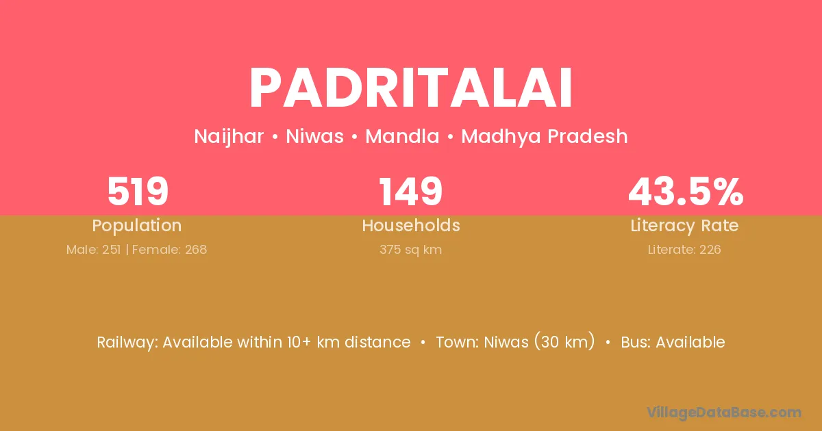 Niwas (30 km) is the nearest town to Padritalai village for major economic activities and is located approximately 30 km away.
