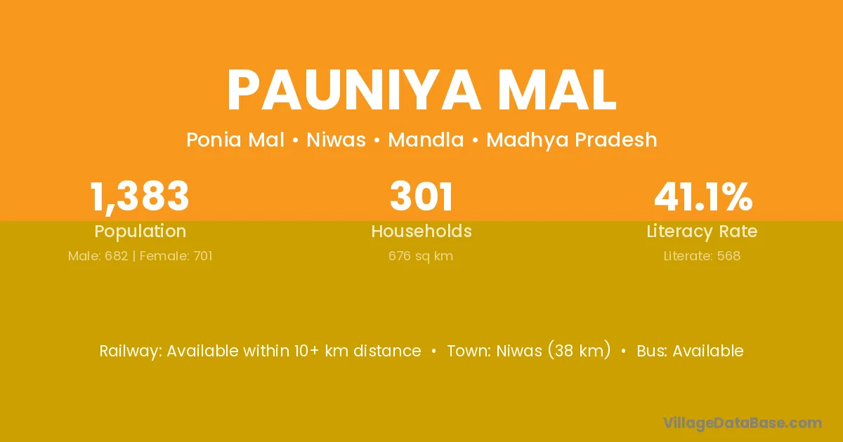 Pauniya Mal village has a total population of 1,383 people, of which 682 are males and 701 are females.