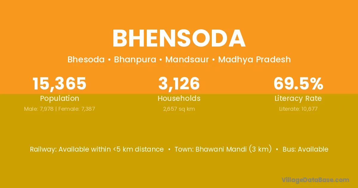 Bhawani Mandi (3 km) is the nearest town to Bhensoda village for major economic activities and is located approximately 3 km away.