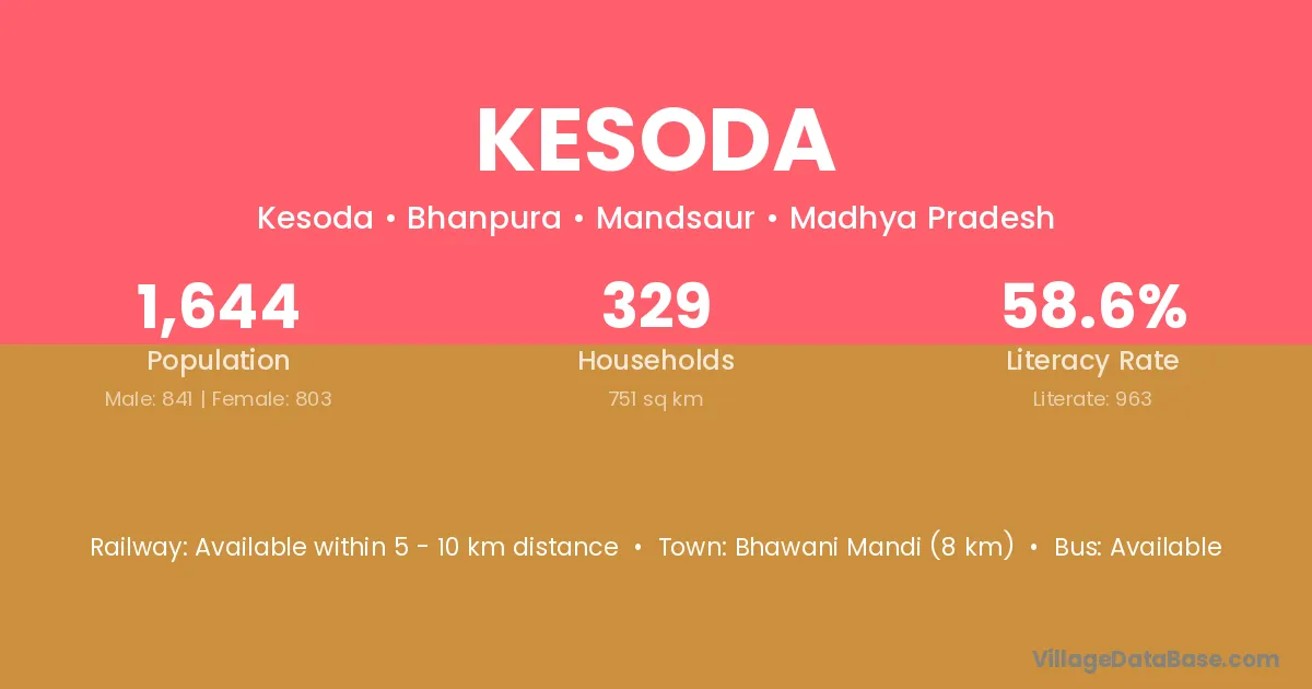 Bhawani Mandi (8 km) is the nearest town to Kesoda village for major economic activities and is located approximately 8 km away.