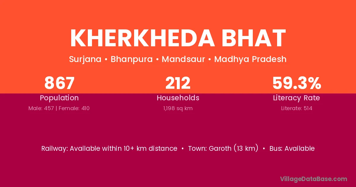 Garoth (13 km) is the nearest town to Kherkheda Bhat village for major economic activities and is located approximately 13 km away.