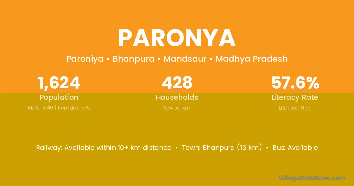 Bhanpura (15 km) is the nearest town to Paronya village for major economic activities and is located approximately 15 km away.