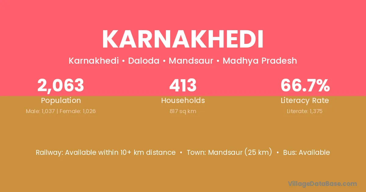 Karnakhedi village has a total population of 2,063 people, of which 1,037 are males and 1,026 are females.