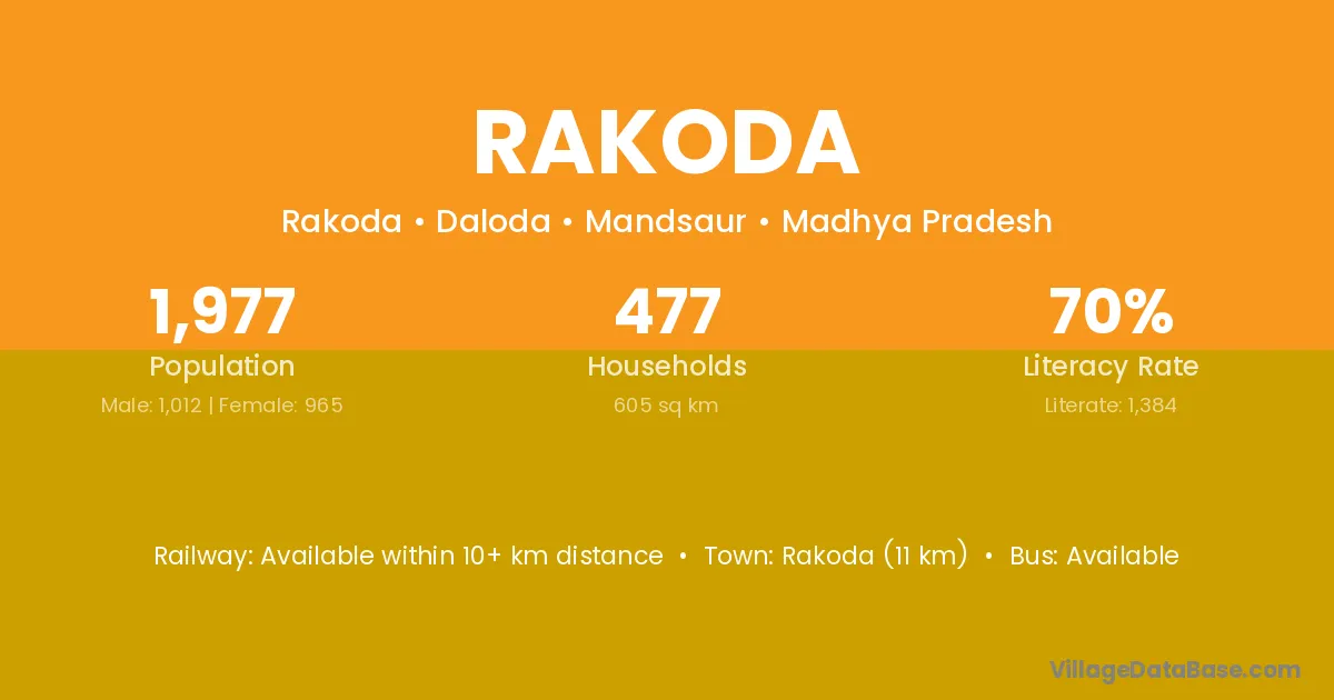 Rakoda (11 km) is the nearest town to Rakoda village for major economic activities and is located approximately 11 km away.