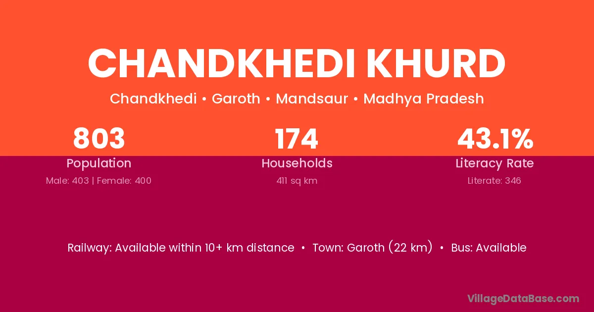 Chandkhedi Khurd village has a total population of 803 people, of which 403 are males and 400 are females.