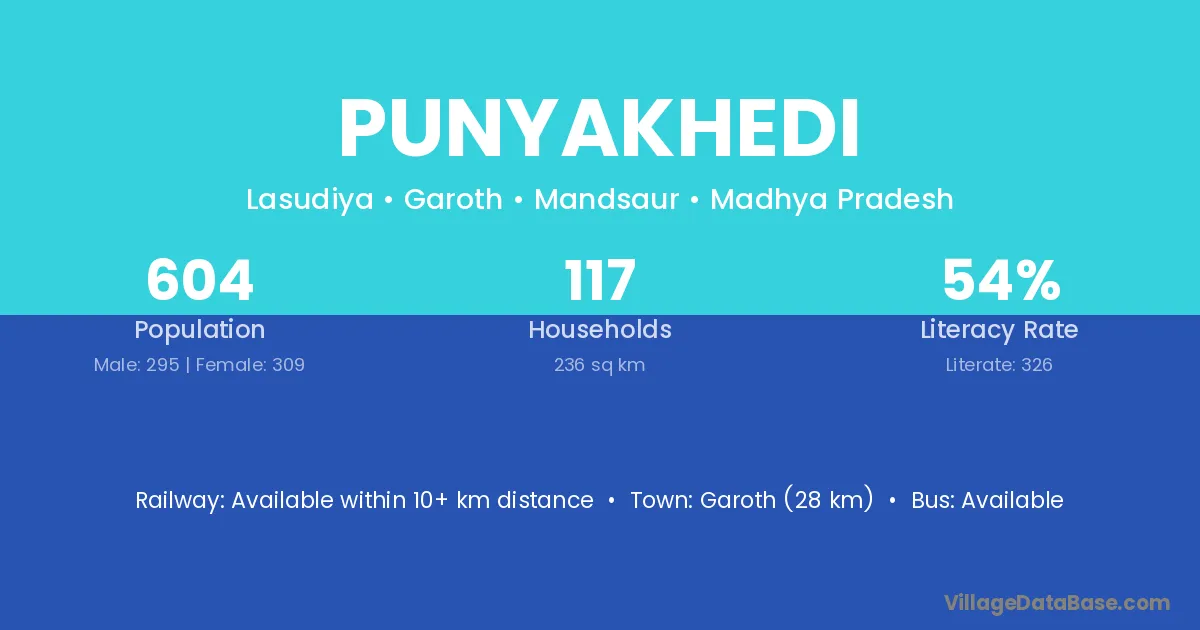Punyakhedi village has a total population of 604 people, of which 295 are males and 309 are females.
