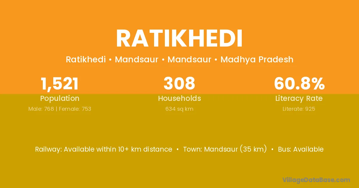 Garoth (8 km) is the nearest town to Ratikhedi village for major economic activities and is located approximately 8 km away.