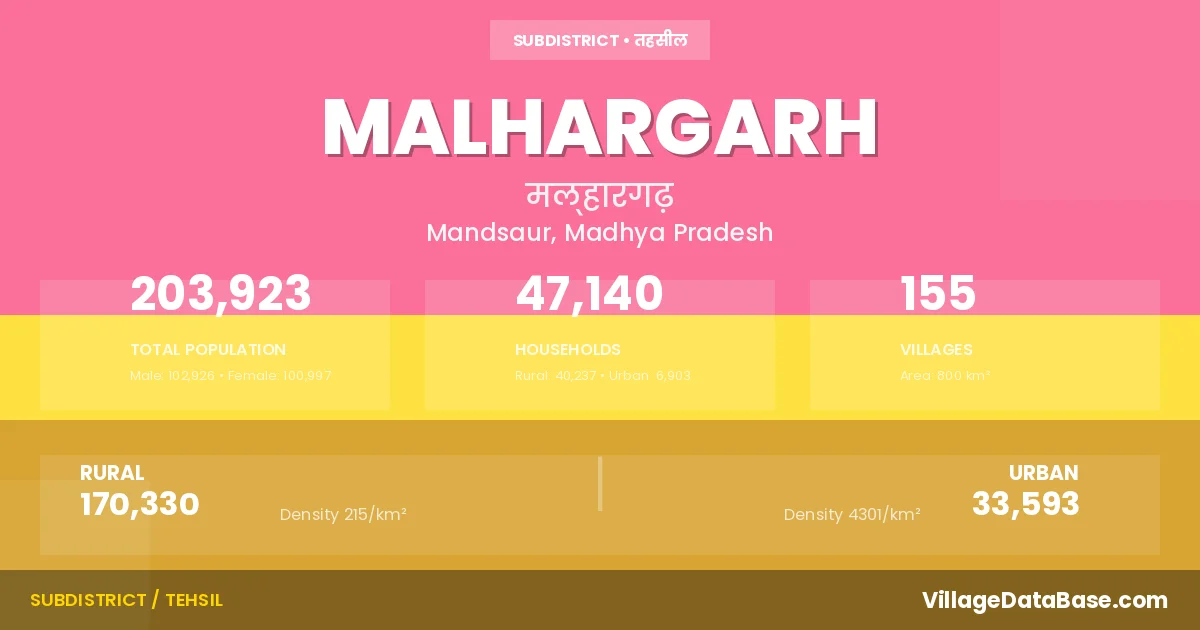 According to the 2011 census The total area of Malhargarh Tehsil is 800 km², with a population of 203923 people. The population density is 255 inhabitants per square kilometre, and there are approximately 47140 houses in the sub district.