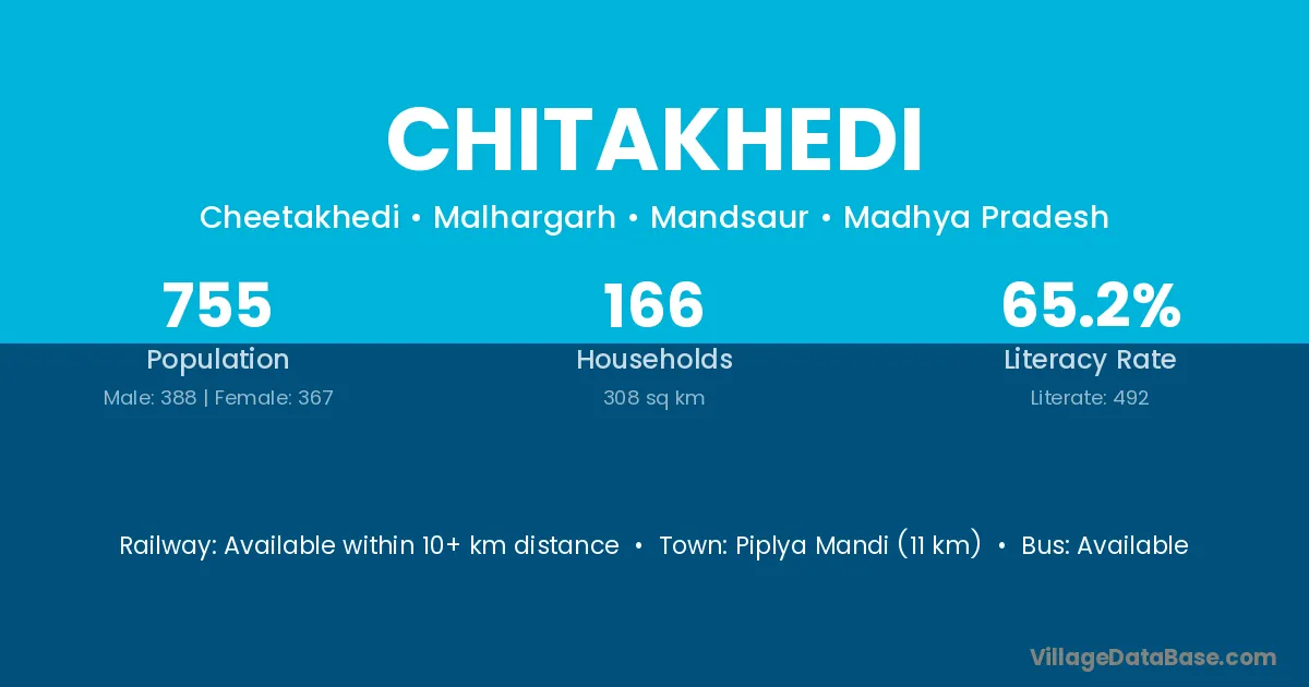 Chitakhedi village has a total population of 755 people, of which 388 are males and 367 are females.