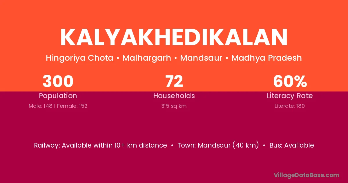 Mandsaur (40 km) is the nearest town to Kalyakhedikalan village for major economic activities and is located approximately 40 km away.