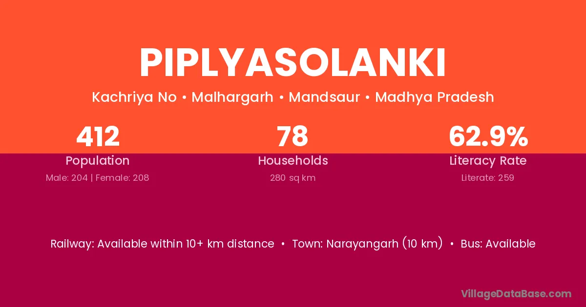 Piplyasolanki village has a total population of 412 people, of which 204 are males and 208 are females.