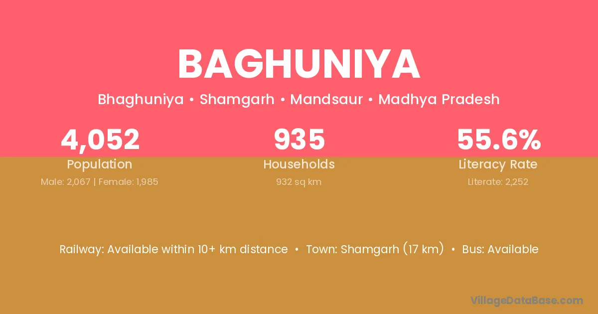Baghuniya village has a total population of 4,052 people, of which 2,067 are males and 1,985 are females.