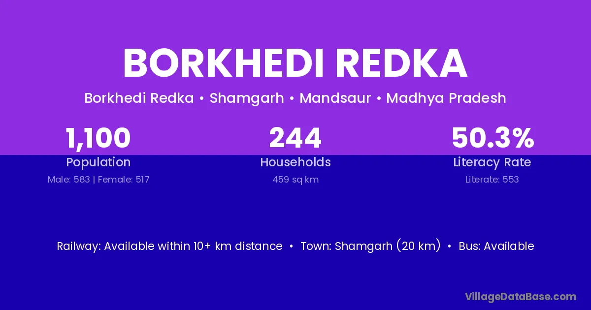 Shamgarh (20 km) is the nearest town to Borkhedi Redka village for major economic activities and is located approximately 20 km away.