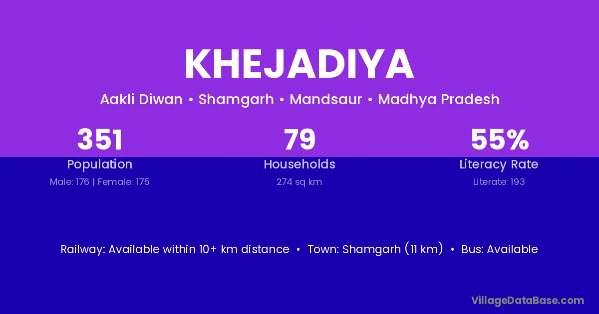 Khejadiya village has a total population of 351 people, of which 176 are males and 175 are females.