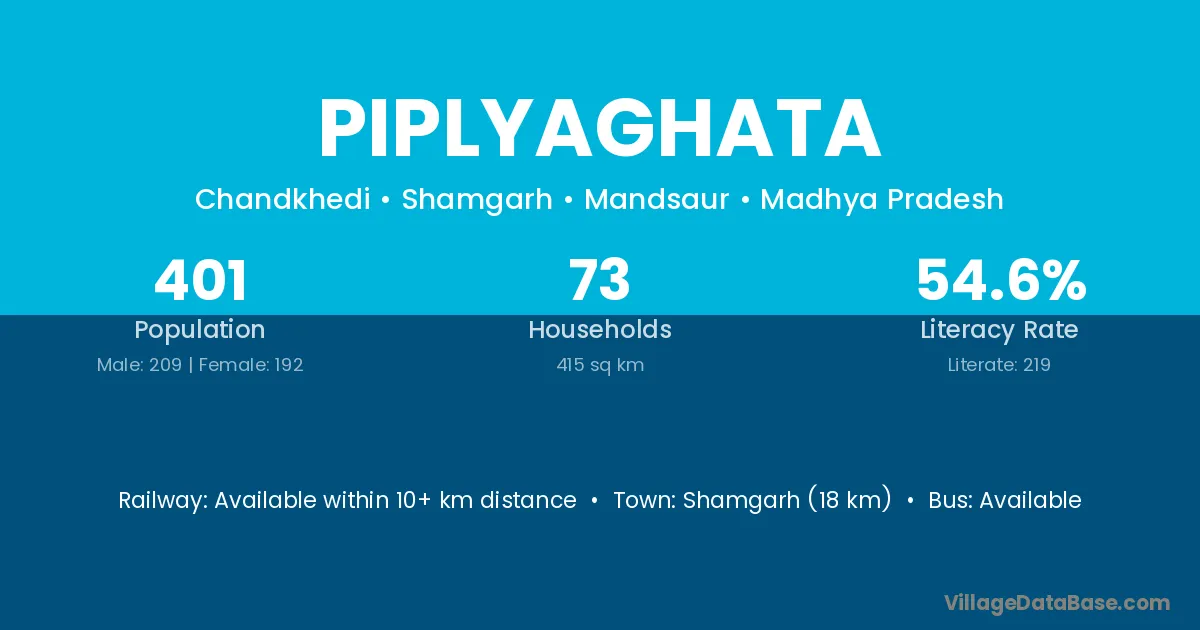 Shamgarh (18 km) is the nearest town to Piplyaghata village for major economic activities and is located approximately 18 km away.