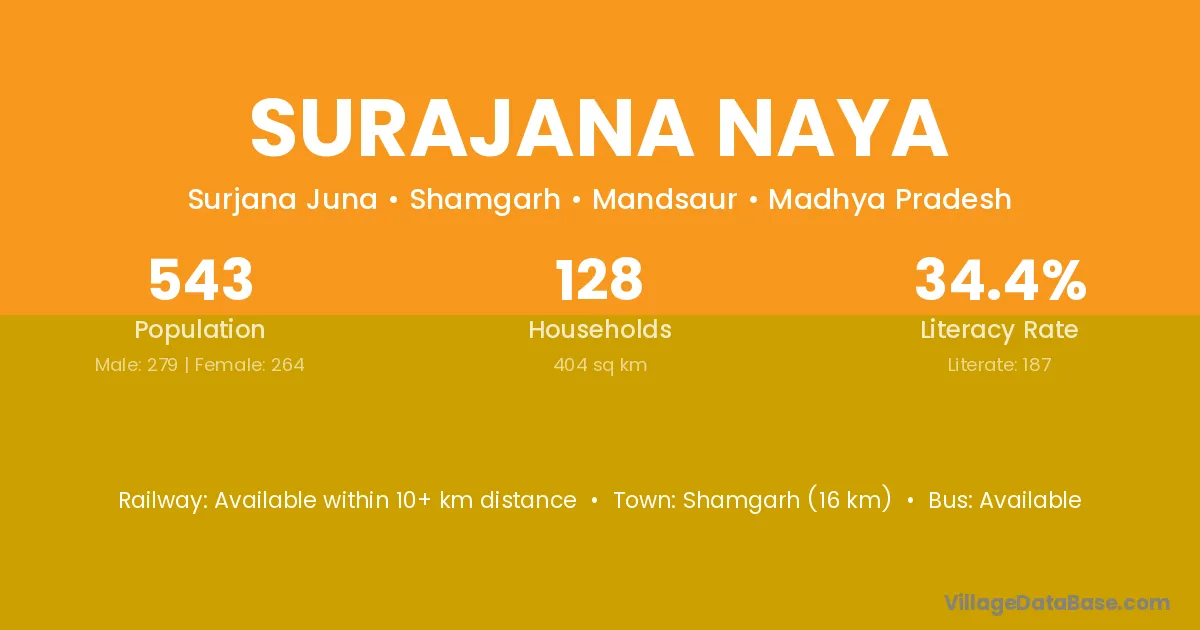 Shamgarh (16 km) is the nearest town to Surajana Naya village for major economic activities and is located approximately 16 km away.