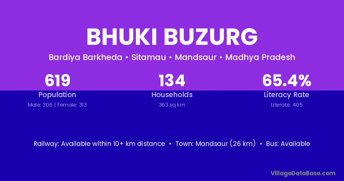 Mandsaur (26 km) is the nearest town to Bhuki Buzurg village for major economic activities and is located approximately 26 km away.