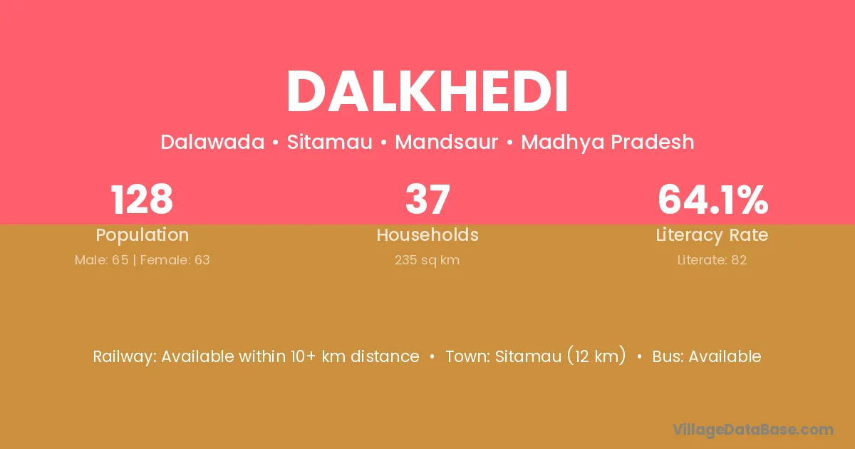 Dalkhedi village has a total population of 128 people, of which 65 are males and 63 are females.