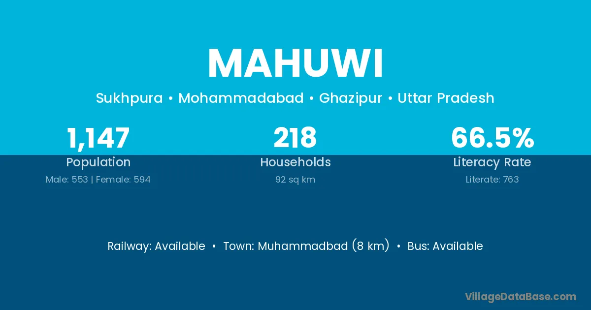 The literacy rate of Mahuwi village is 61.94%. Male literacy stands at 74.19% and female literacy at 49.28%.