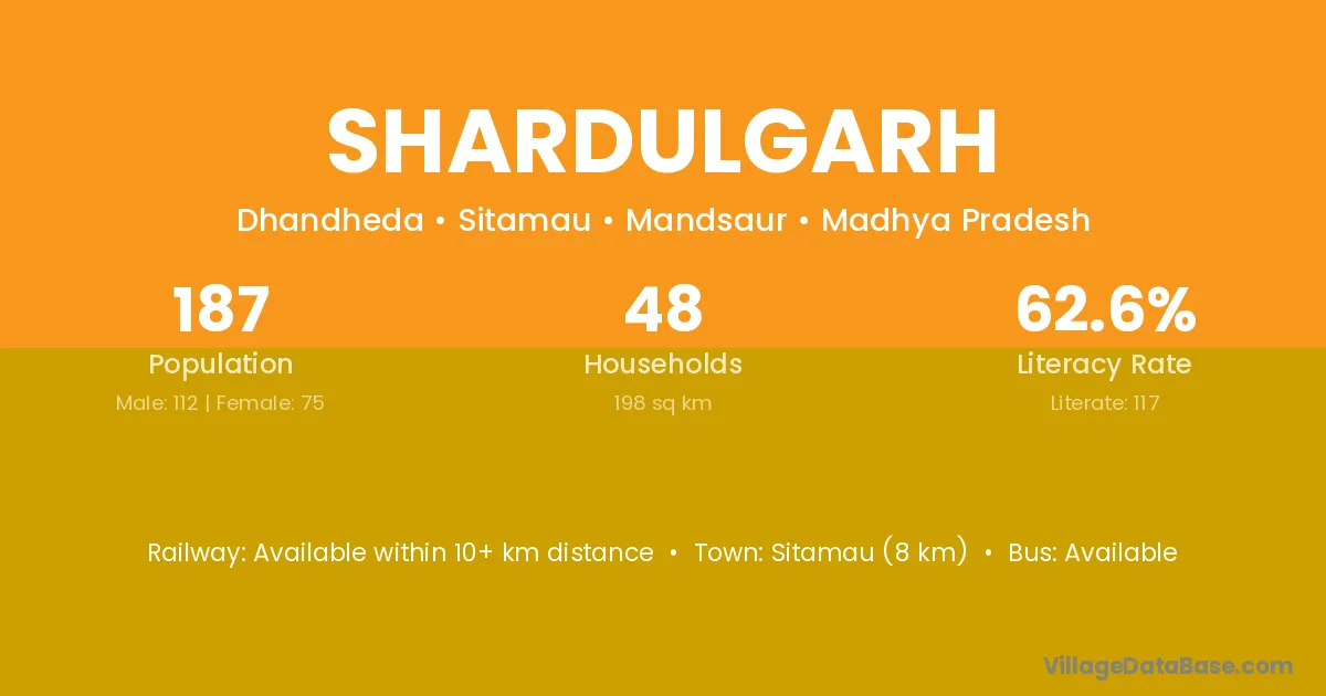 Sitamau (8 km) is the nearest town to Shardulgarh village for major economic activities and is located approximately 8 km away.