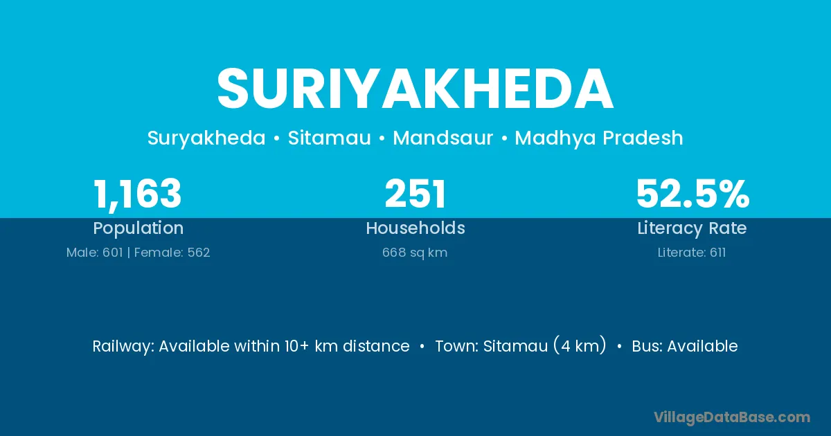Sitamau (4 km) is the nearest town to Suriyakheda village for major economic activities and is located approximately 4 km away.