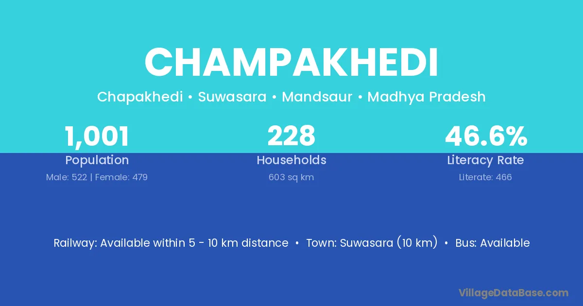 Champakhedi village has a total population of 1,001 people, of which 522 are males and 479 are females.