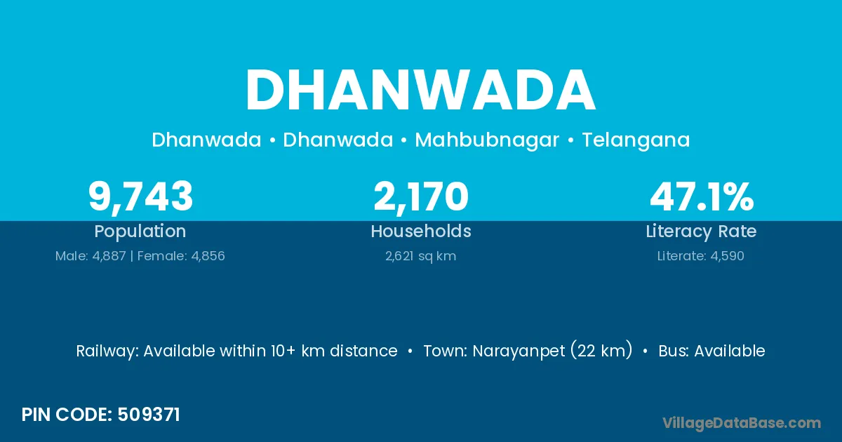Suwasara (14 km) is the nearest town to Dhanwada village for major economic activities and is located approximately 14 km away.
