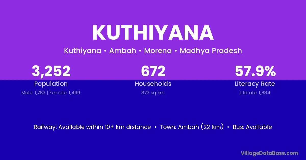 Ambah (22 km) is the nearest town to Kuthiyana village for major economic activities and is located approximately 22 km away.