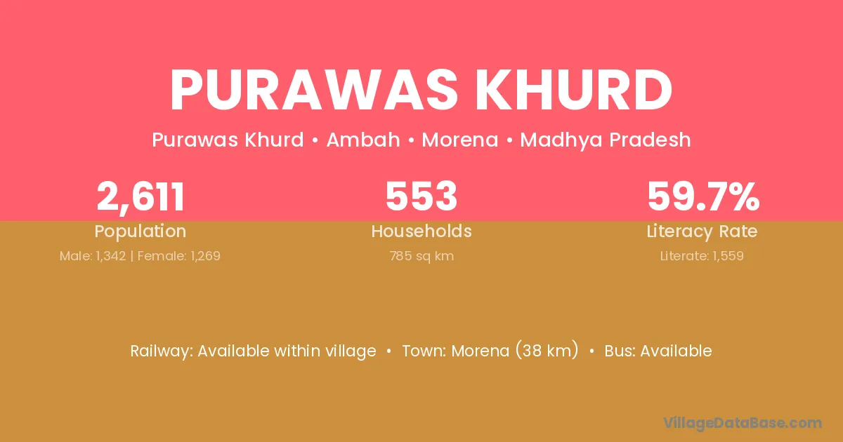 Morena (38 km) is the nearest town to Purawas Khurd village for major economic activities and is located approximately 38 km away.