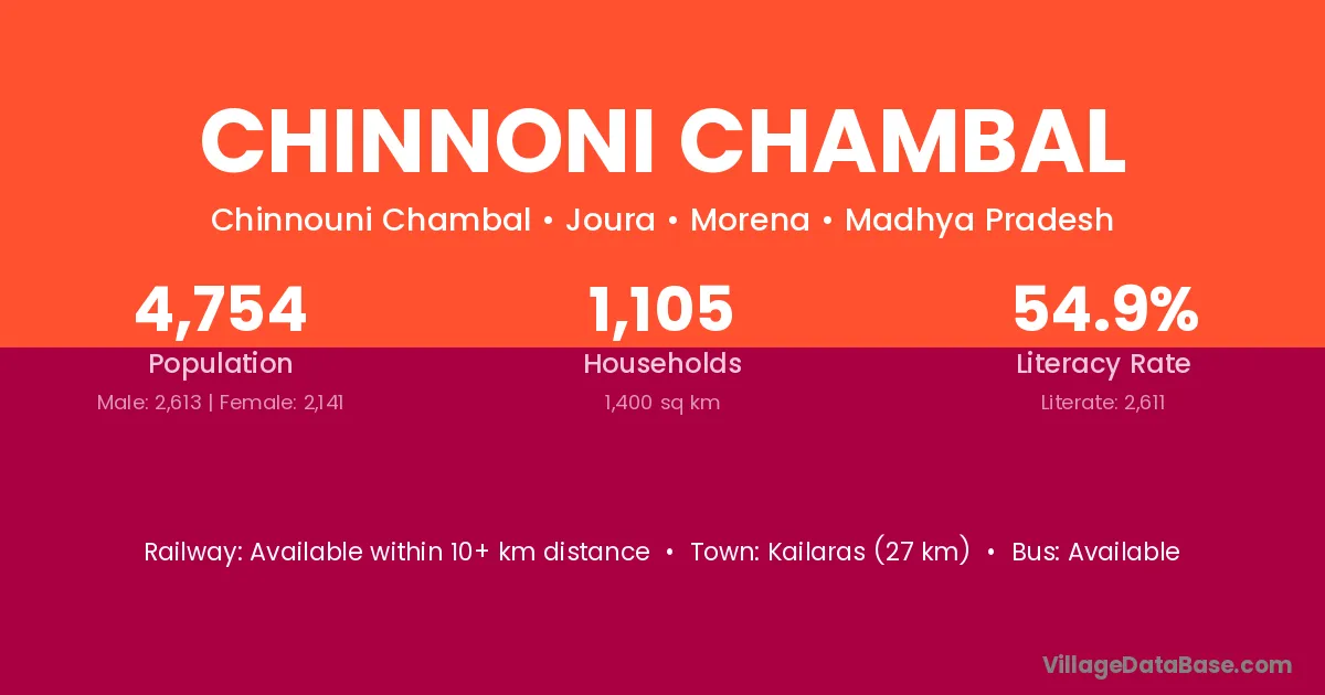 Chinnoni Chambal village has a total population of 4,754 people, of which 2,613 are males and 2,141 are females.
