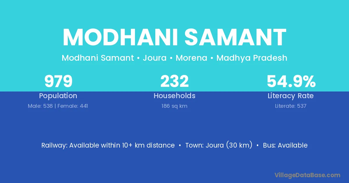 Modhani Samant village has a total population of 979 people, of which 538 are males and 441 are females.