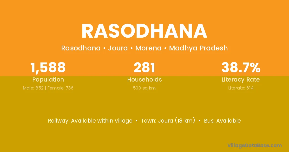 Joura (18 km) is the nearest town to Rasodhana village for major economic activities and is located approximately 18 km away.