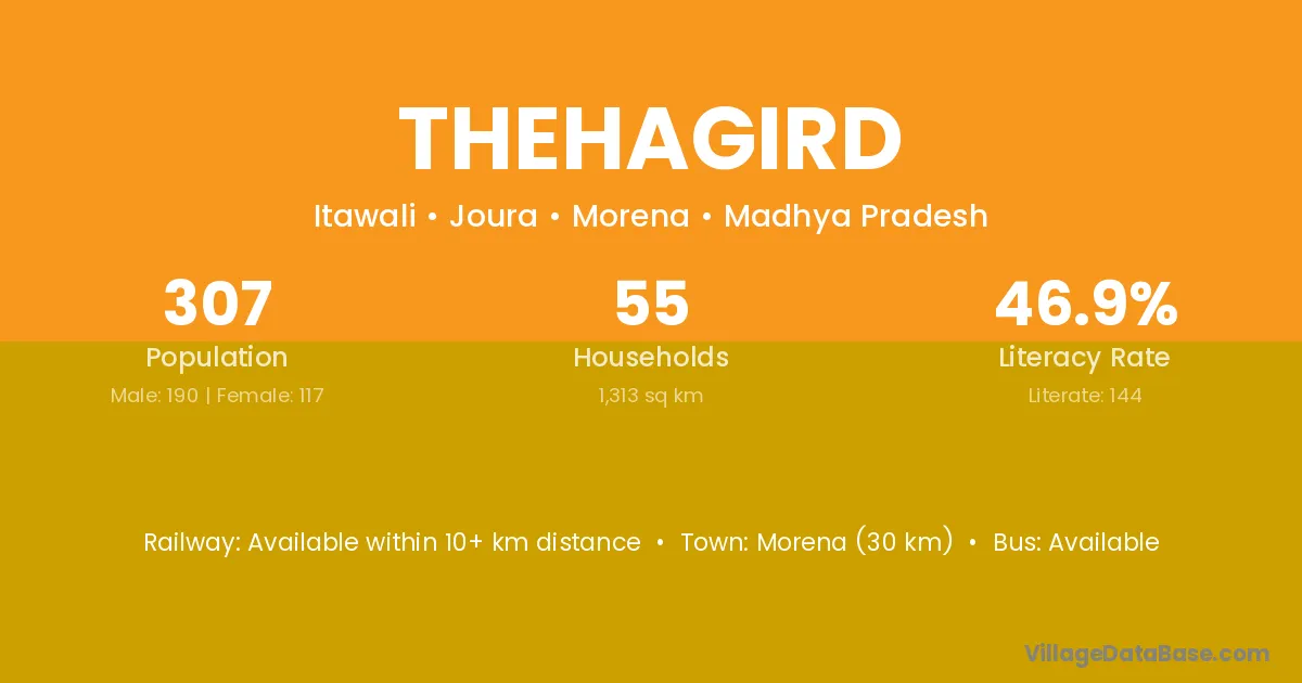 Morena (30 km) is the nearest town to Thehagird village for major economic activities and is located approximately 30 km away.