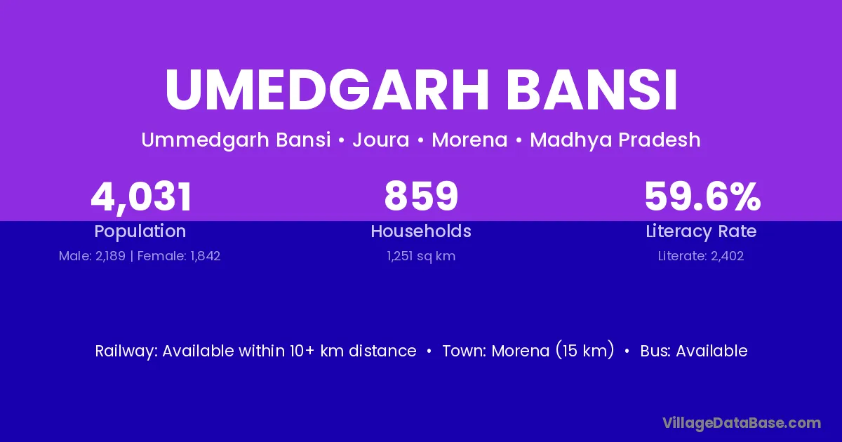 Morena (15 km) is the nearest town to Umedgarh Bansi village for major economic activities and is located approximately 15 km away.