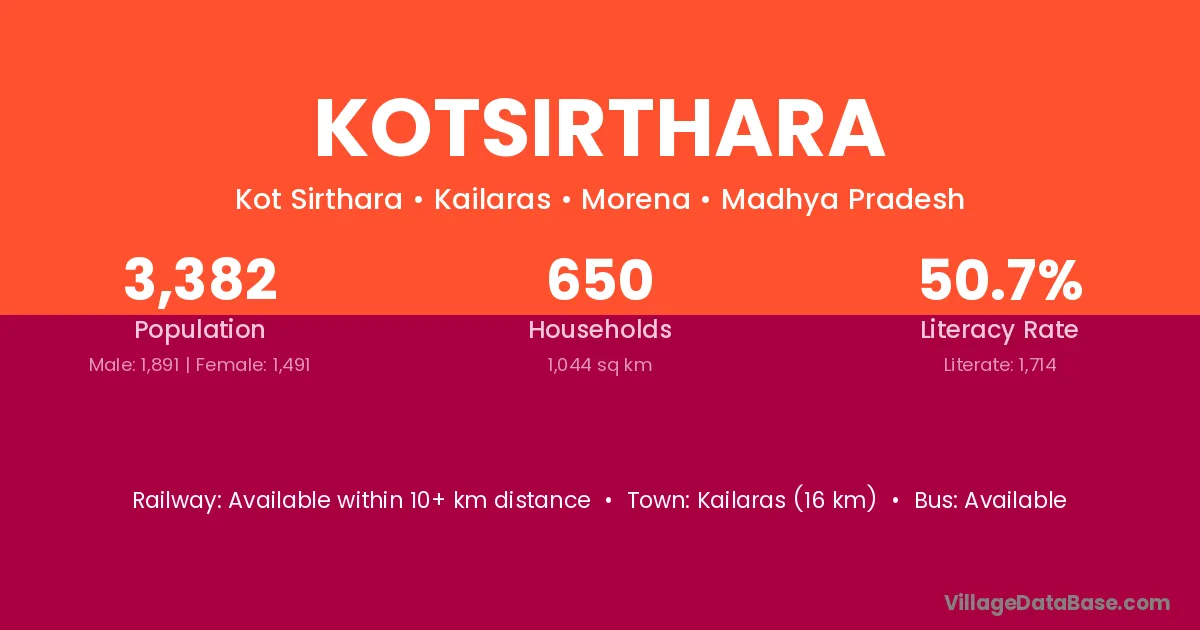 Kailaras (16 km) is the nearest town to Kotsirthara village for major economic activities and is located approximately 16 km away.