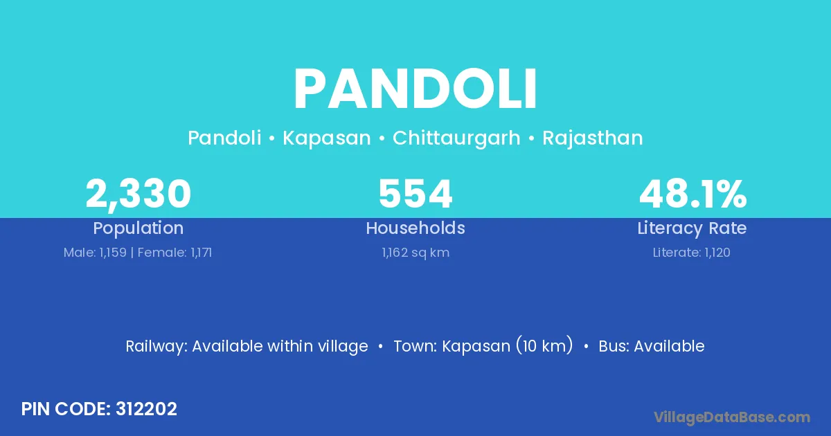 The literacy rate of Pandoli village is 52.72%. Male literacy stands at 64.37% and female literacy at 38.71%.