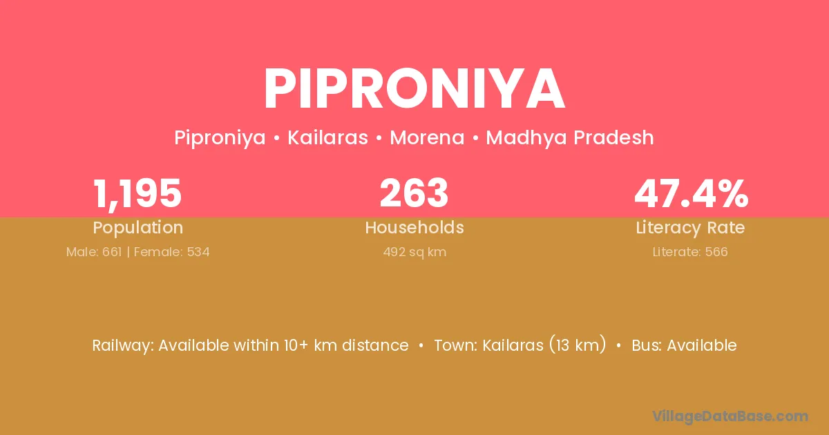 Kailaras (13 km) is the nearest town to Piproniya village for major economic activities and is located approximately 13 km away.