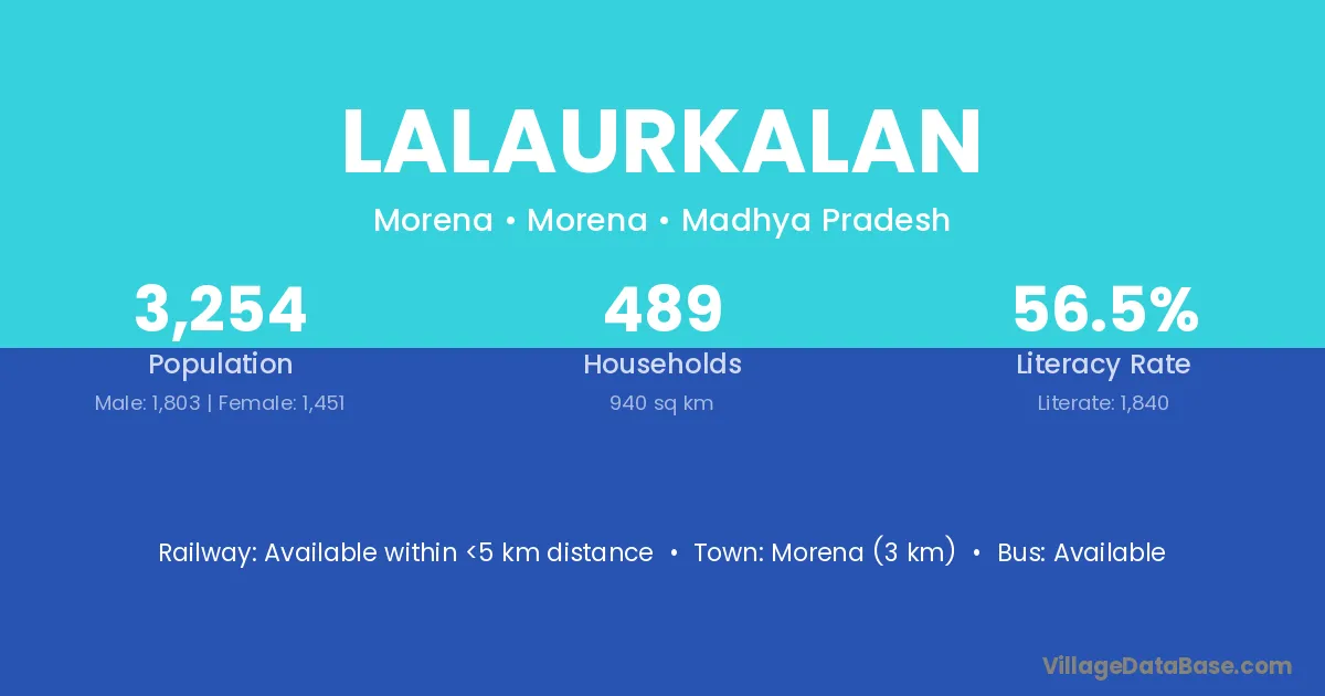 Morena (3 km) is the nearest town to Lalaurkalan village for major economic activities and is located approximately 3 km away.