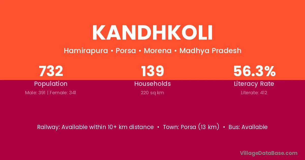 Porsa (13 km) is the nearest town to Kandhkoli village for major economic activities and is located approximately 13 km away.