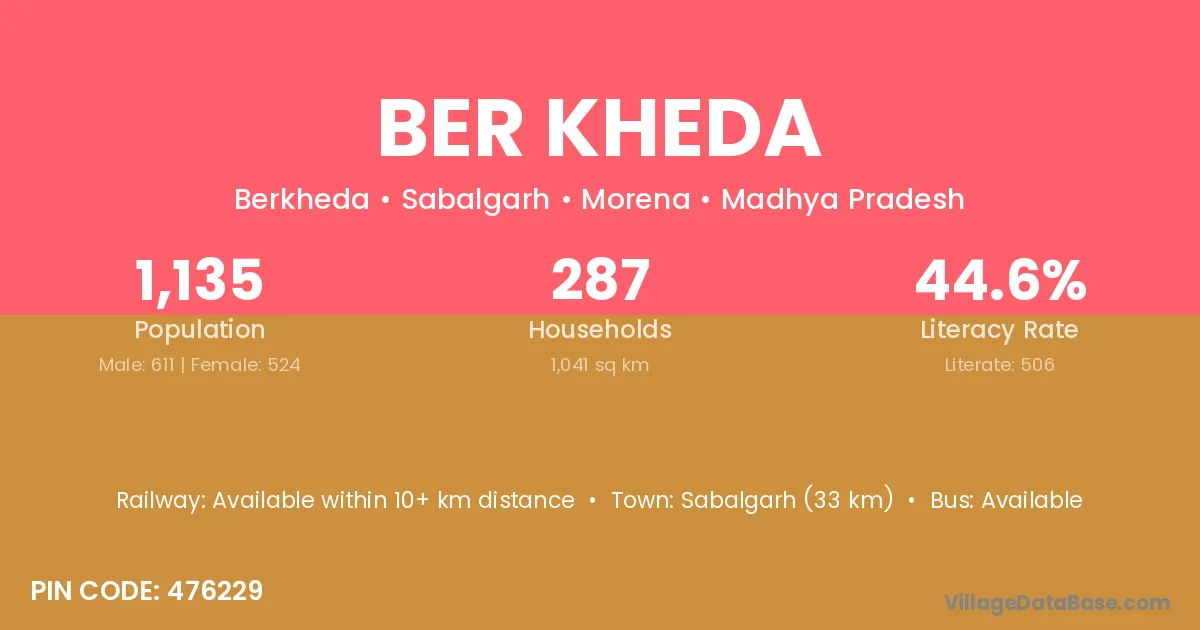 Sabalgarh (33 km) is the nearest town to Ber Kheda village for major economic activities and is located approximately 33 km away.