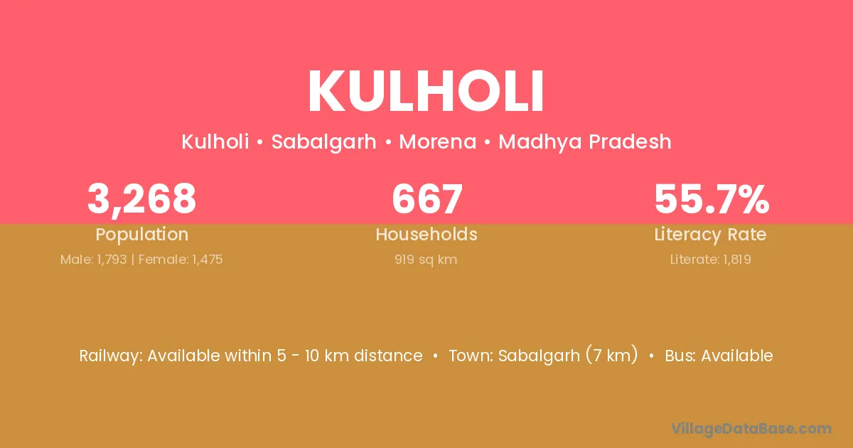 Sabalgarh (7 km) is the nearest town to Kulholi village for major economic activities and is located approximately 7 km away.