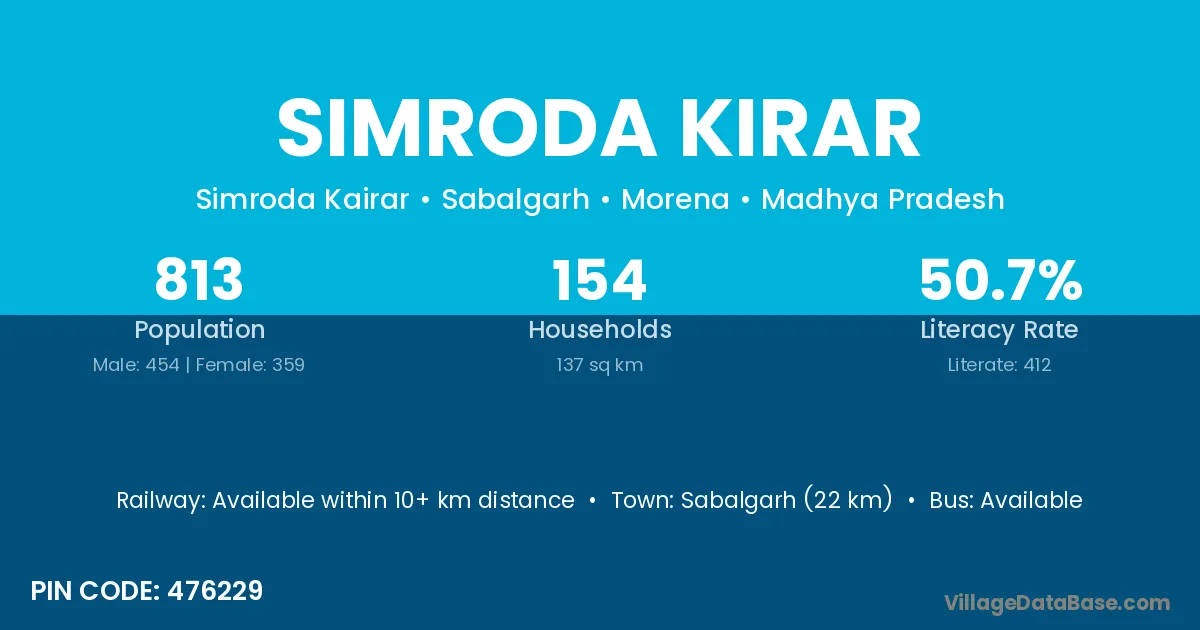 Sabalgarh (22 km) is the nearest town to Simroda Kirar village for major economic activities and is located approximately 22 km away.