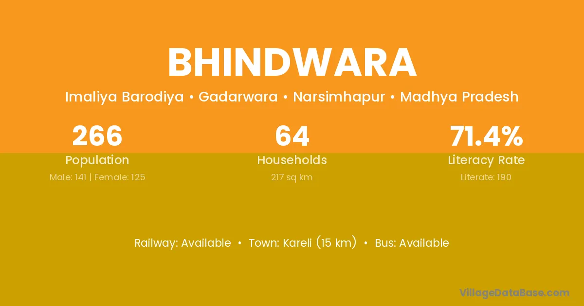 Kareli (15 km) is the nearest town to Bhindwara village for major economic activities and is located approximately 15 km away.