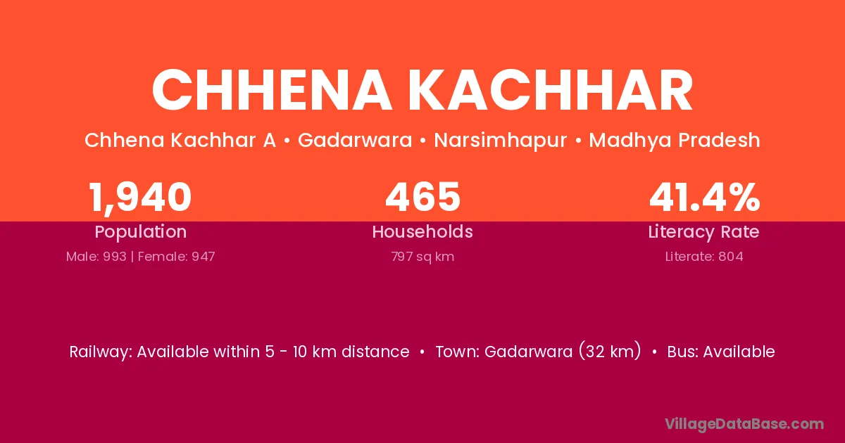 Gadarwara (32 km) is the nearest town to Chhena Kachhar village for major economic activities and is located approximately 32 km away.