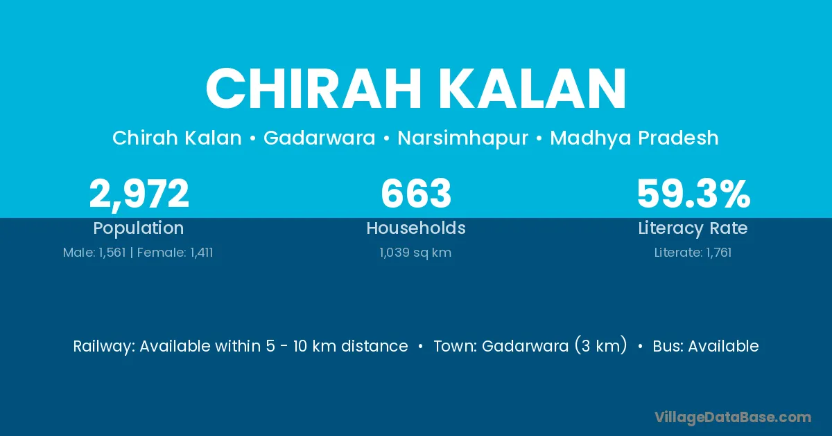 Gadarwara (3 km) is the nearest town to Chirah Kalan village for major economic activities and is located approximately 3 km away.