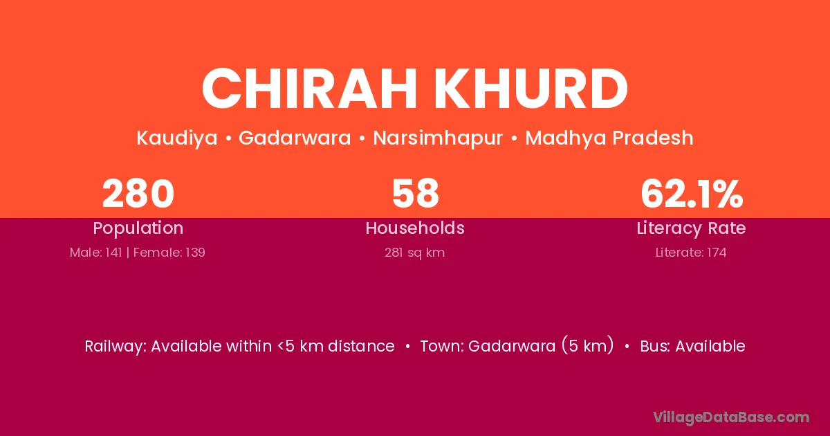Gadarwara (5 km) is the nearest town to Chirah Khurd village for major economic activities and is located approximately 5 km away.