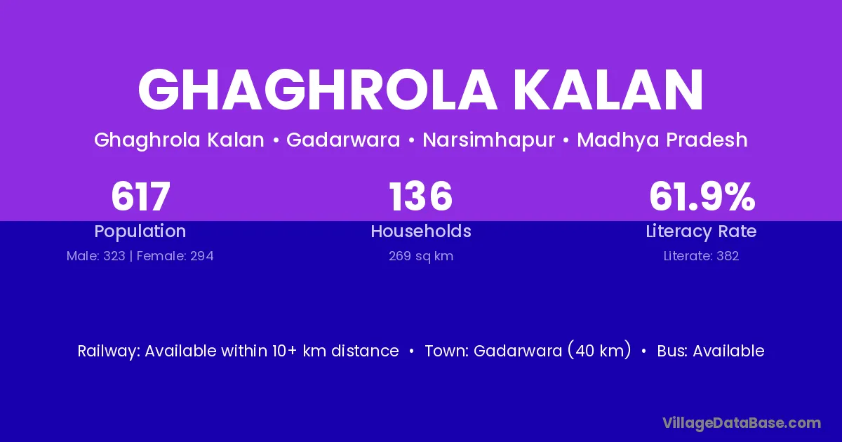 Gadarwara (40 km) is the nearest town to Ghaghrola Kalan village for major economic activities and is located approximately 40 km away.