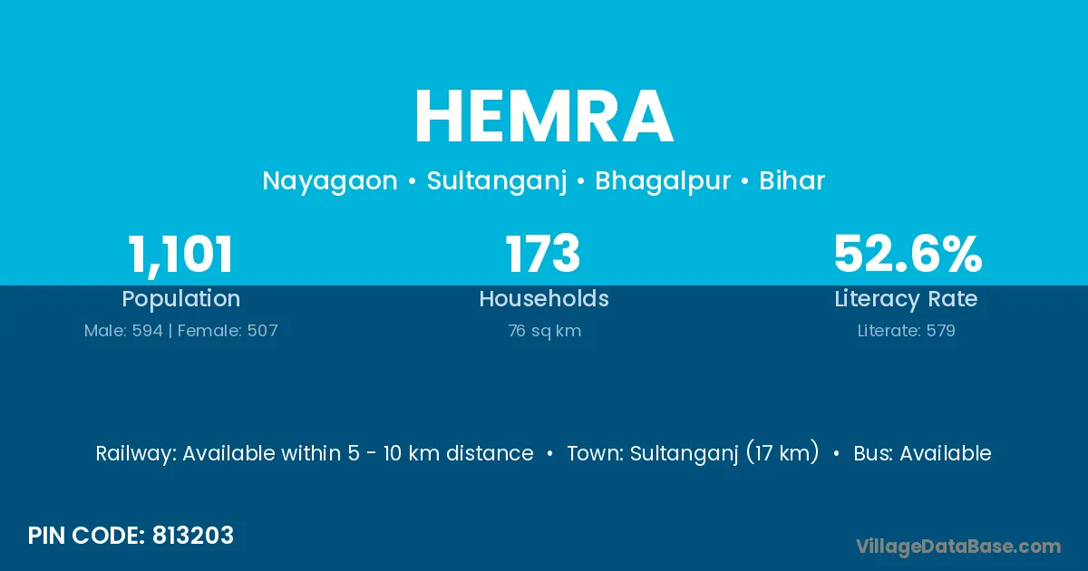 Hemra village has a total population of 863 people, of which 431 are males and 432 are females.